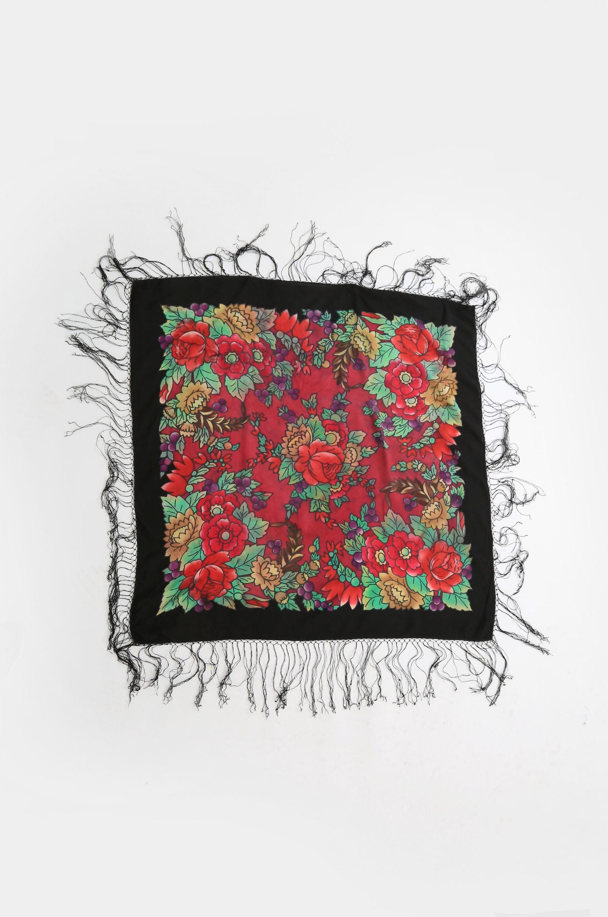 Black hand knotted fringe with colorful silk floral motif