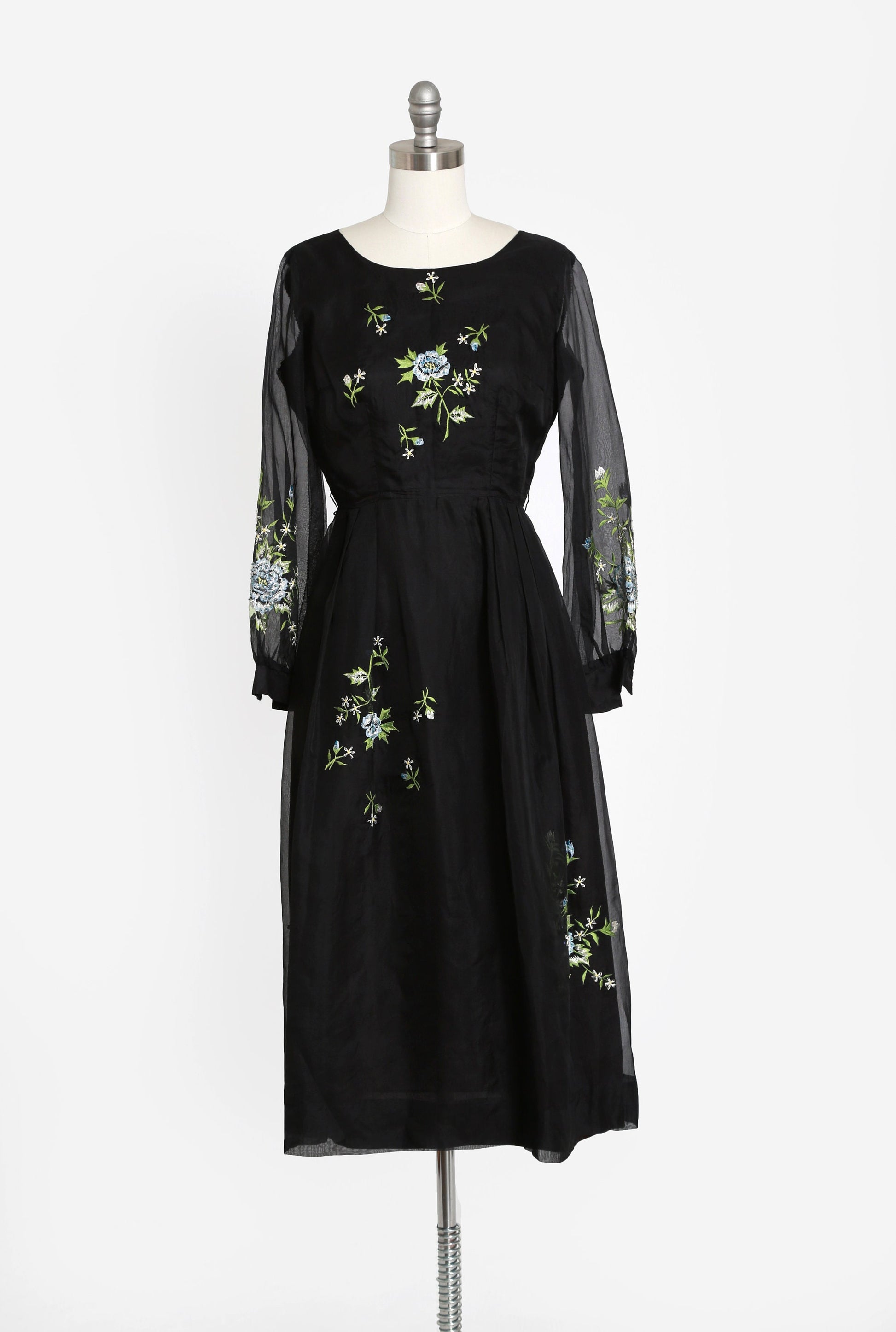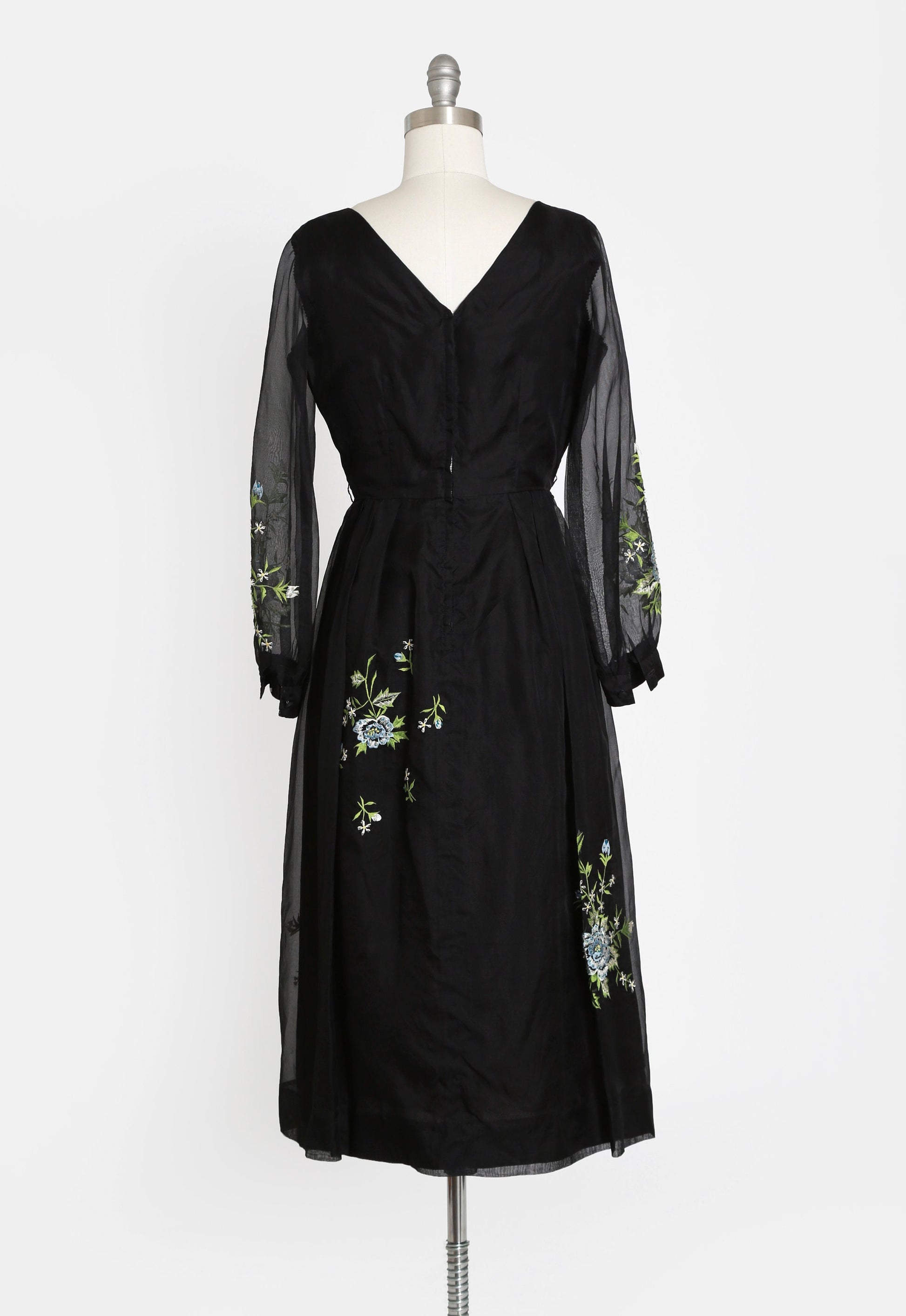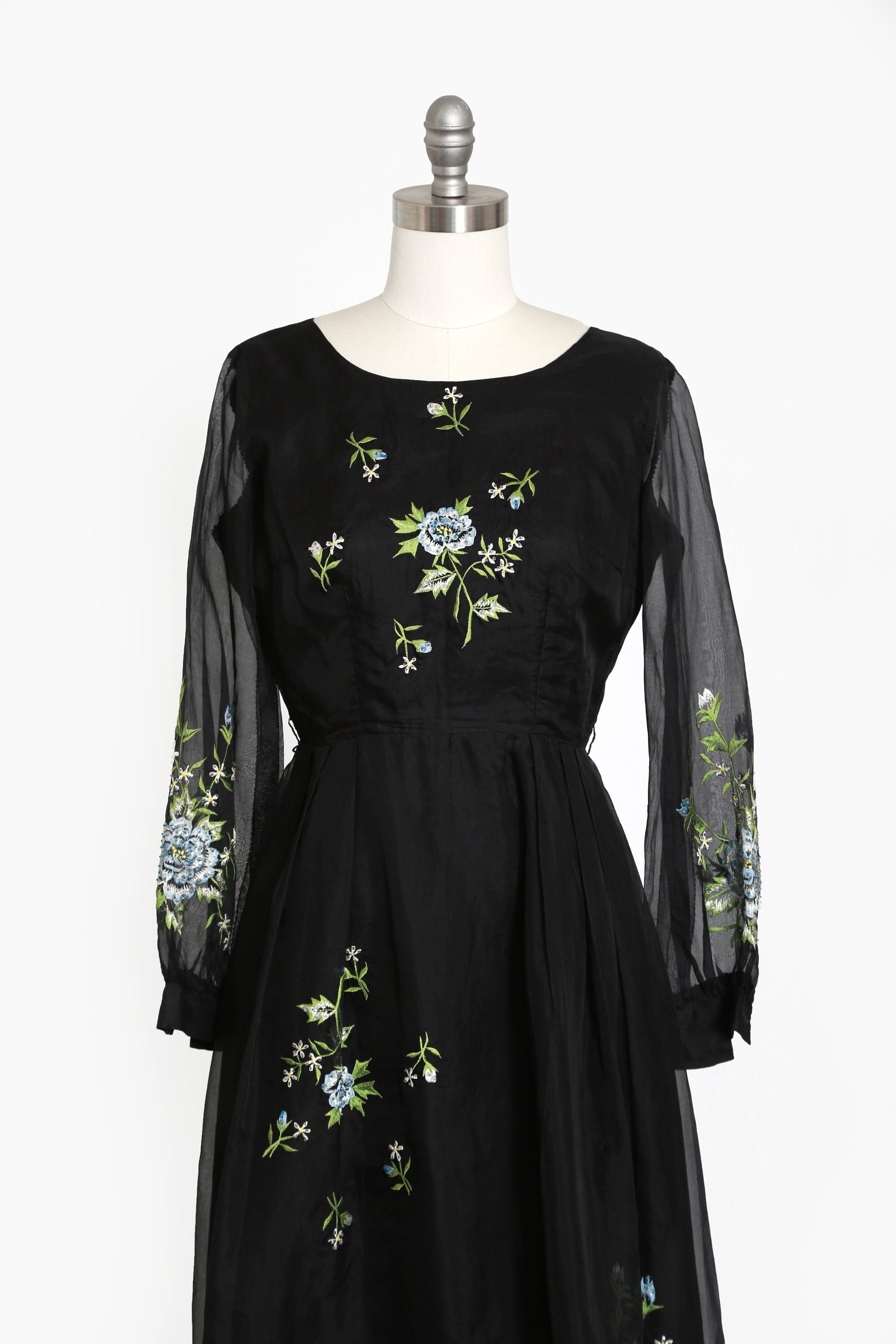 50s Chiffon dress | Vintage 1950s black embroidered beaded sequin dress