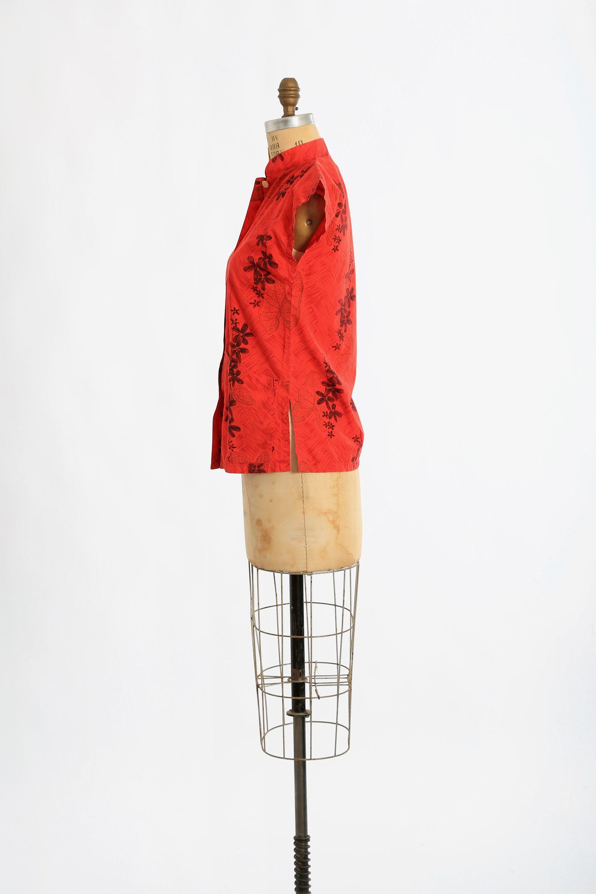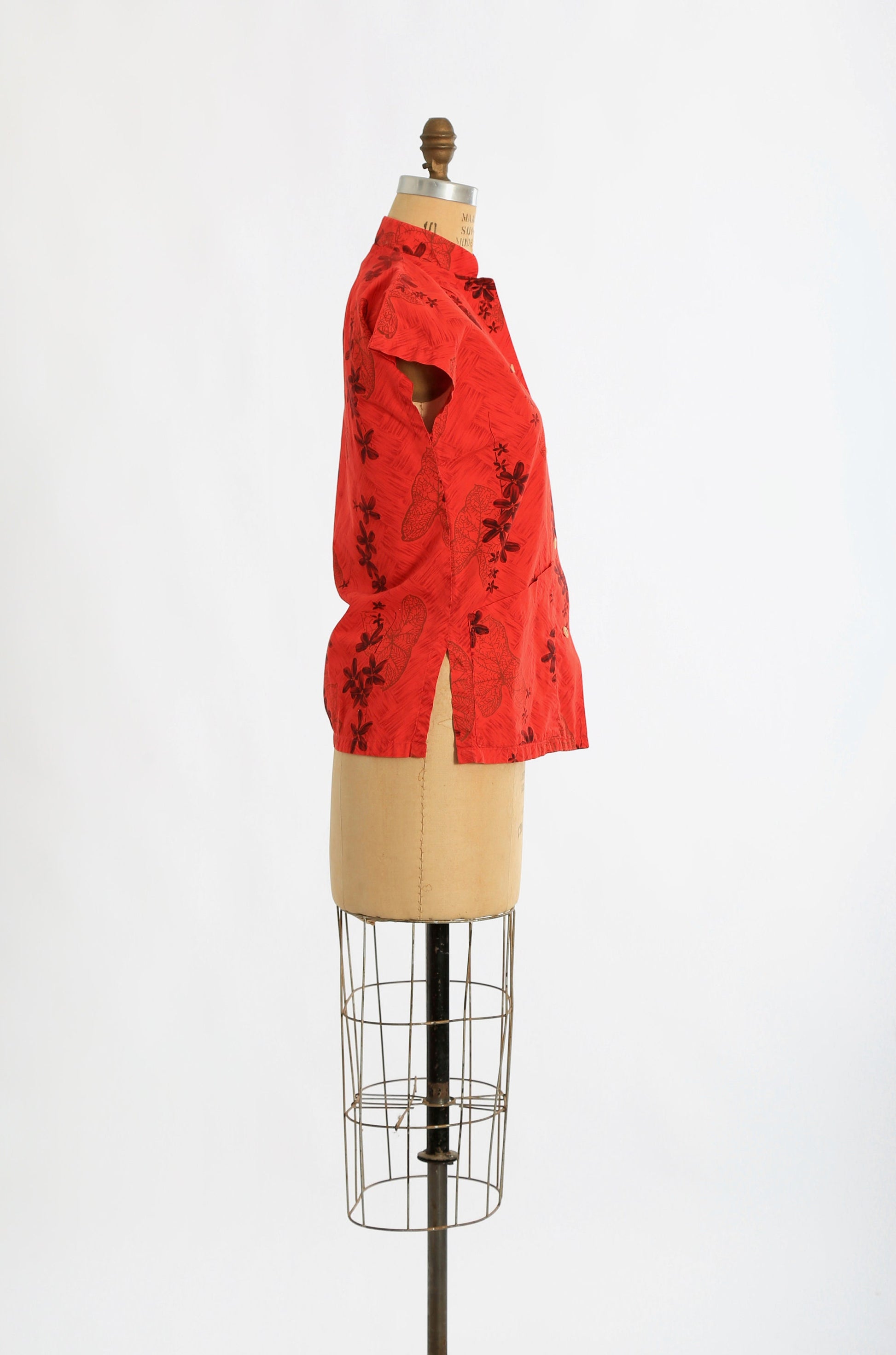 50s Hawaiian shirt | Vintage 1950s red Hawaiian tropical leaf cotton blouse