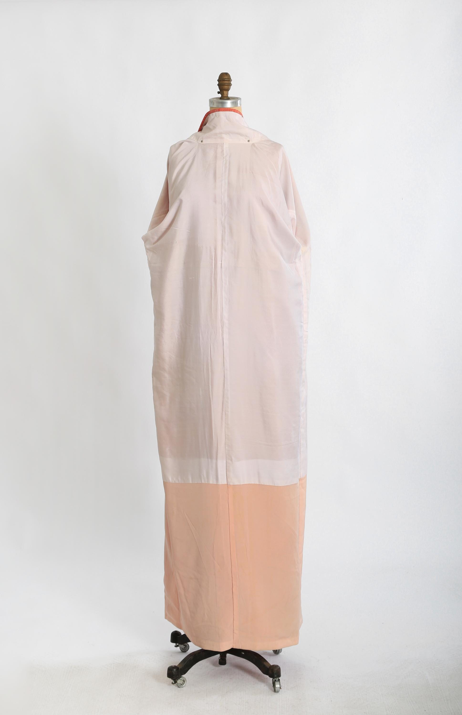 Feels like a tightly woven silk, lined in a pink satin + silk lining