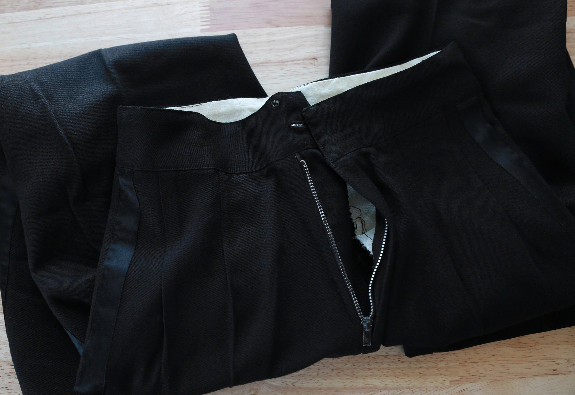 Wool tuxedo pants with metal zipper, side pockets & 2 back pockets (pockets lined in cotton)