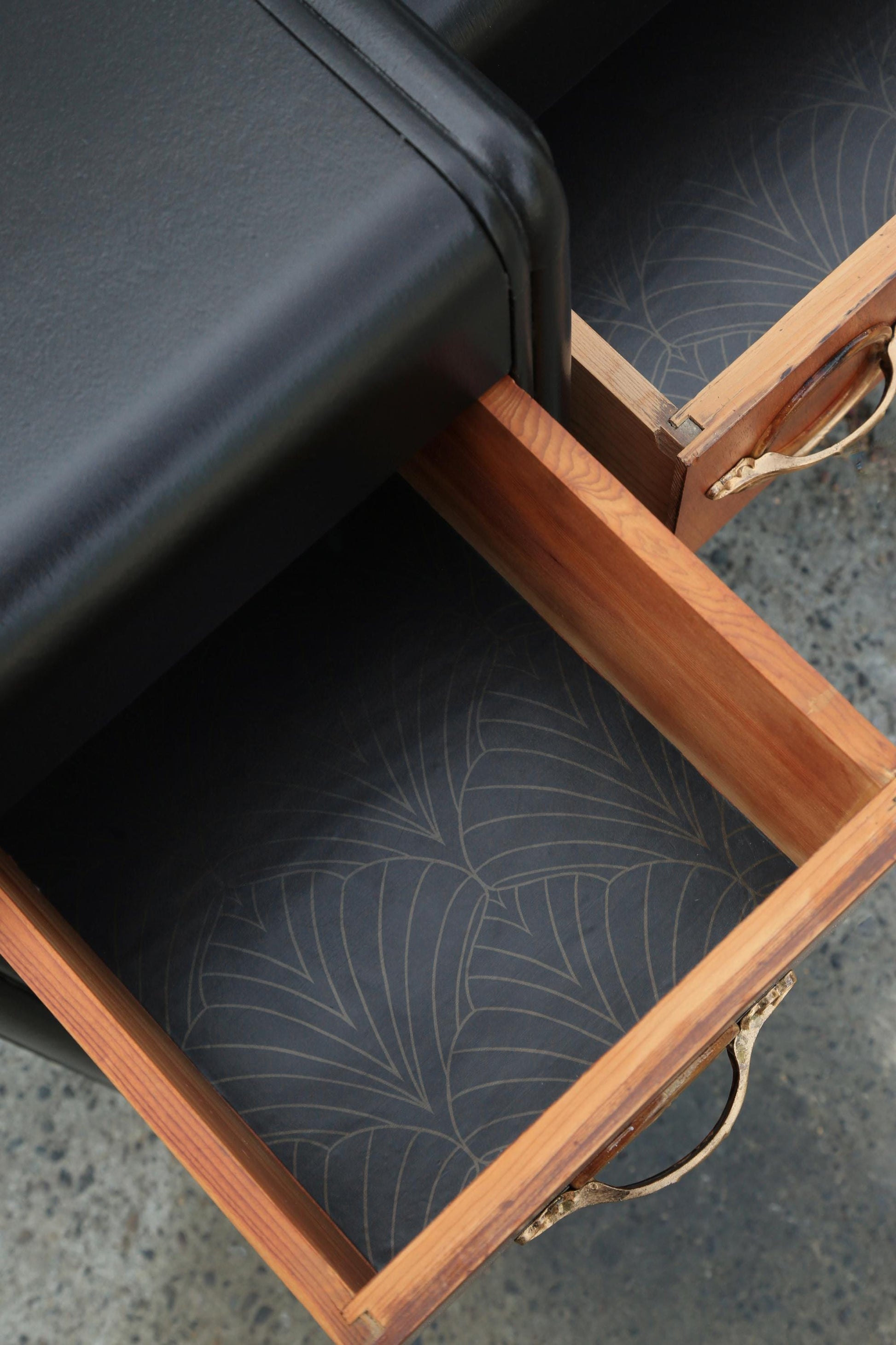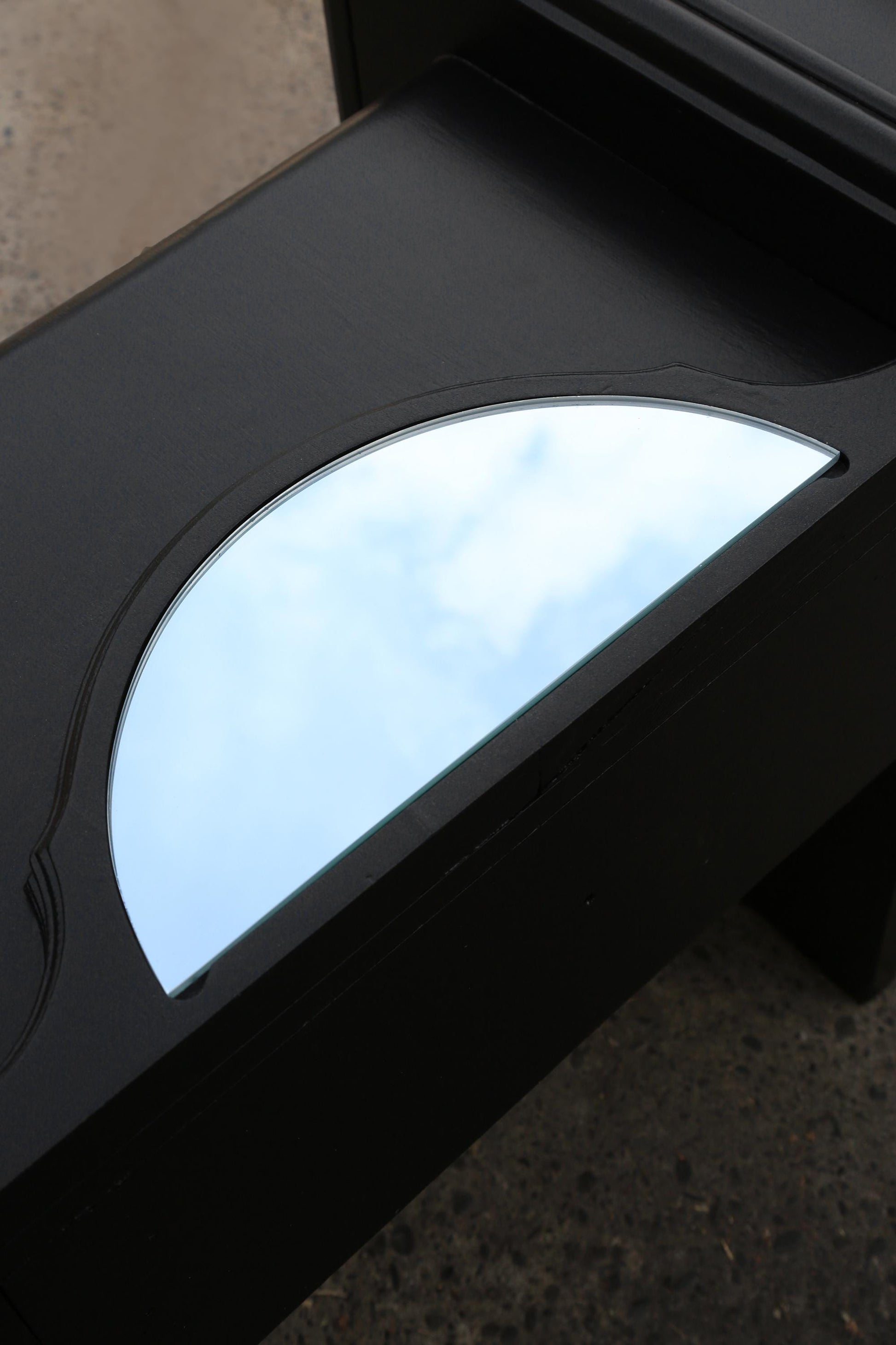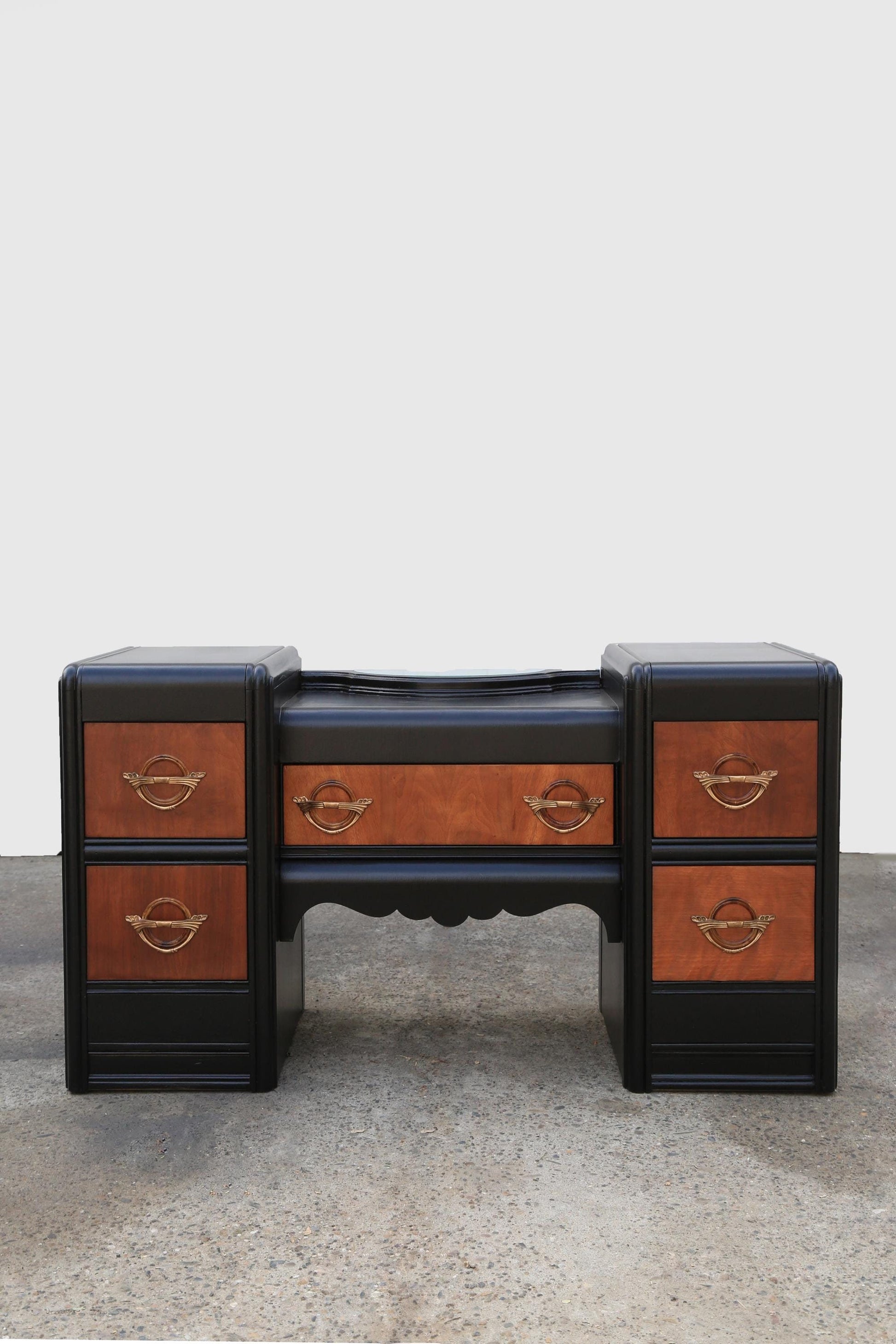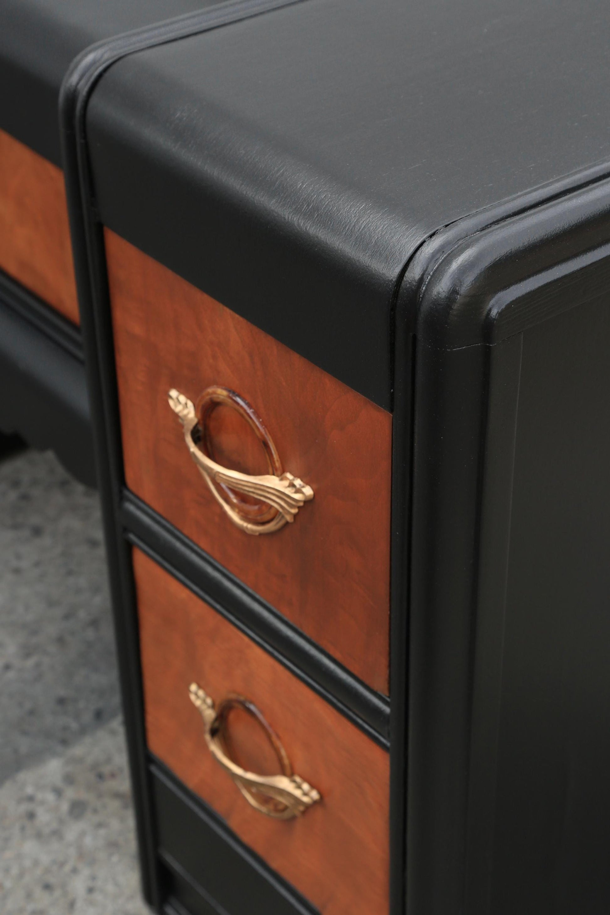 Antique 1930s Waterfall vanity refinished in a beautiful black satin with satin wood drawers & original gold Art Deco drawer pulls. Drawers slide freely and lined in a waterproof art deco print. Brand new replaced half moon mirror on top with hidden compartment underneath.