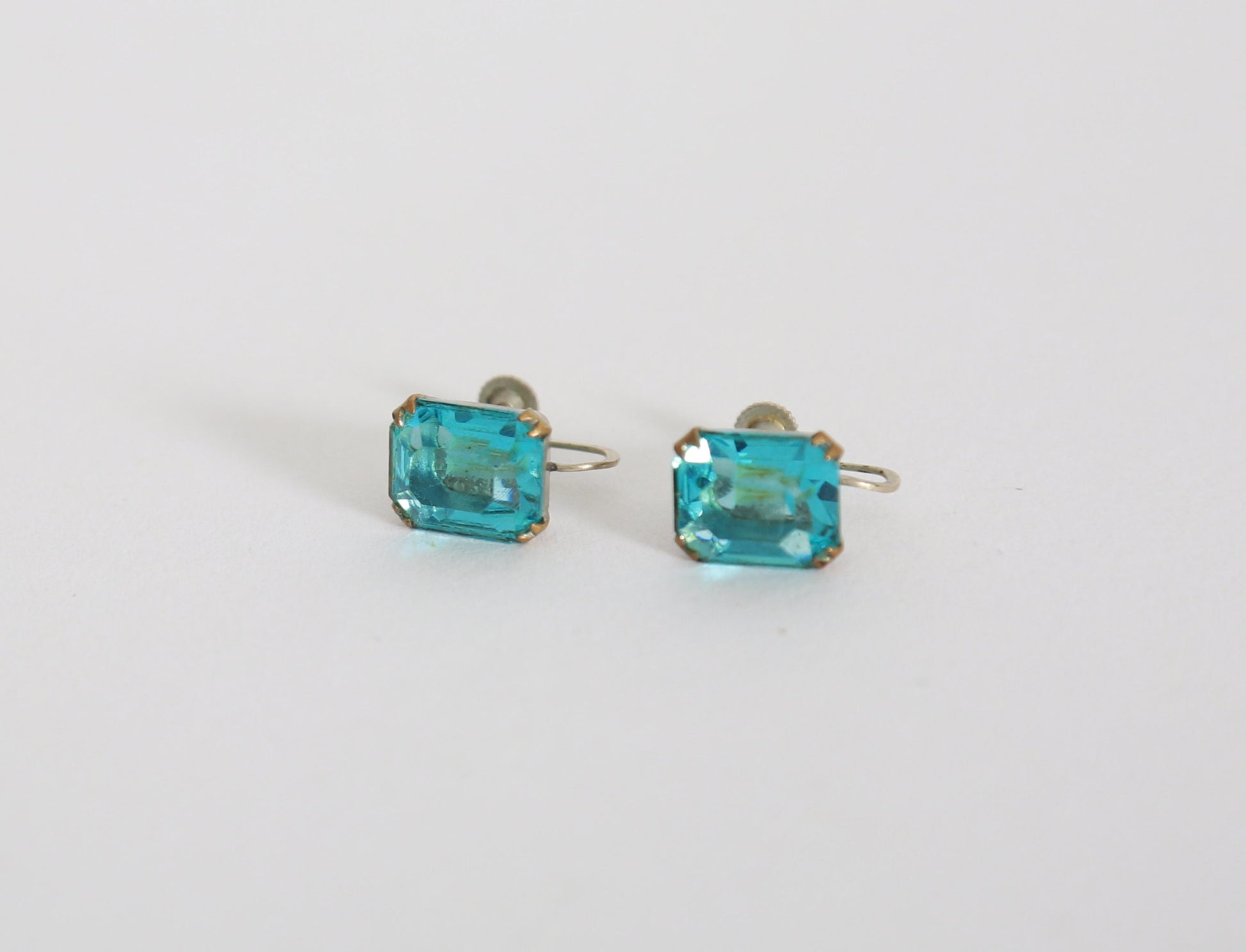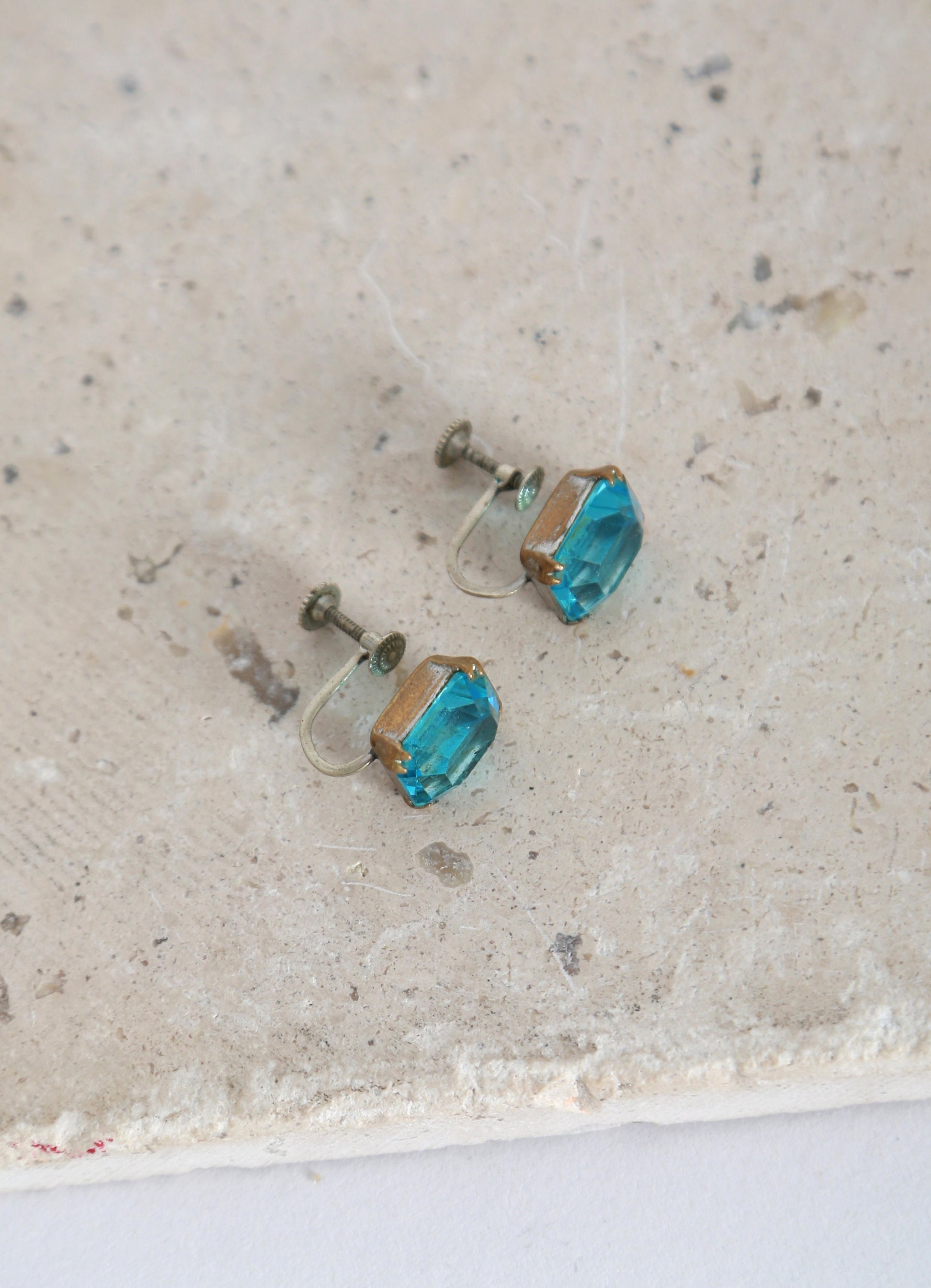 Vintage 1950s blue cut glass emerald cut clip on earrings