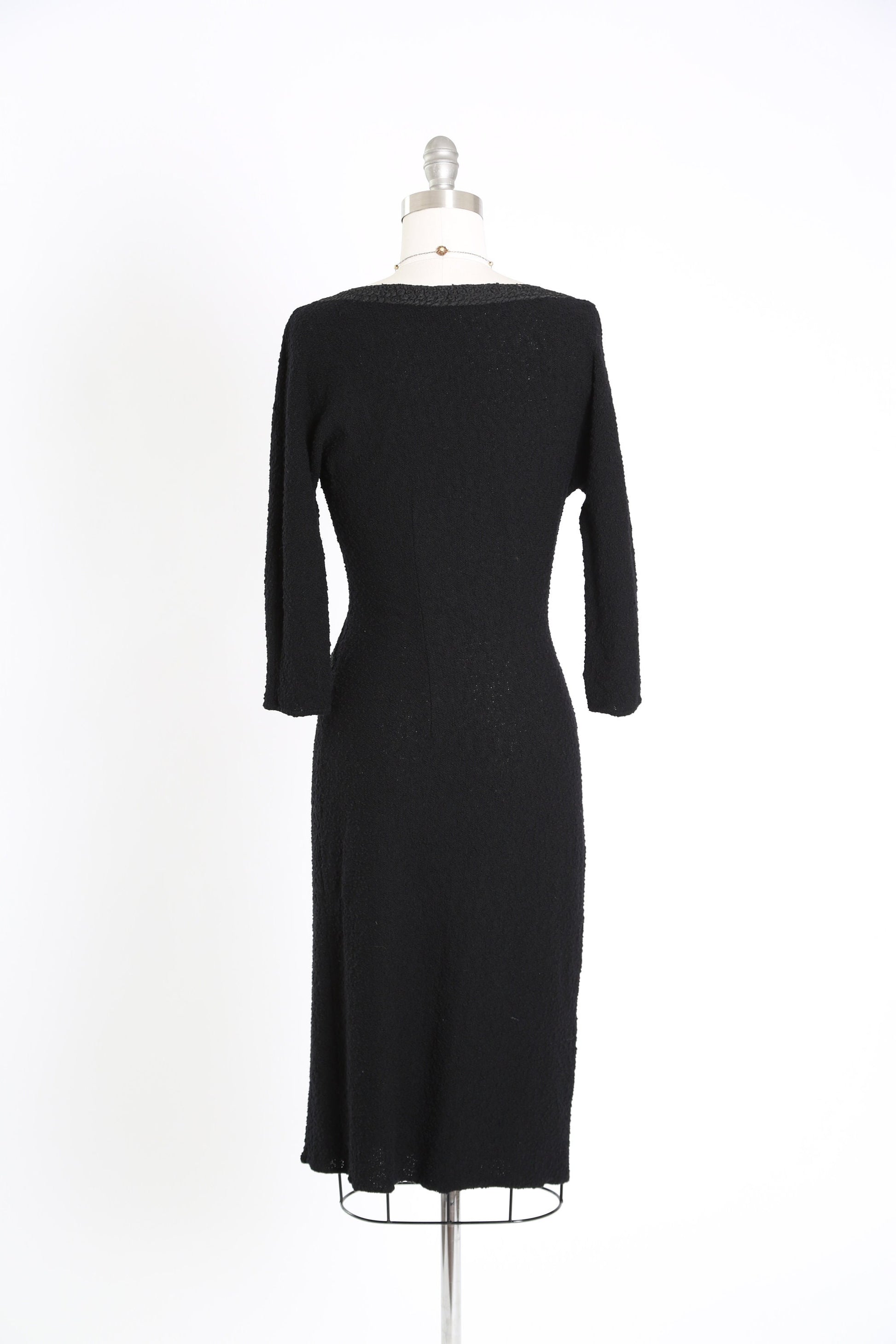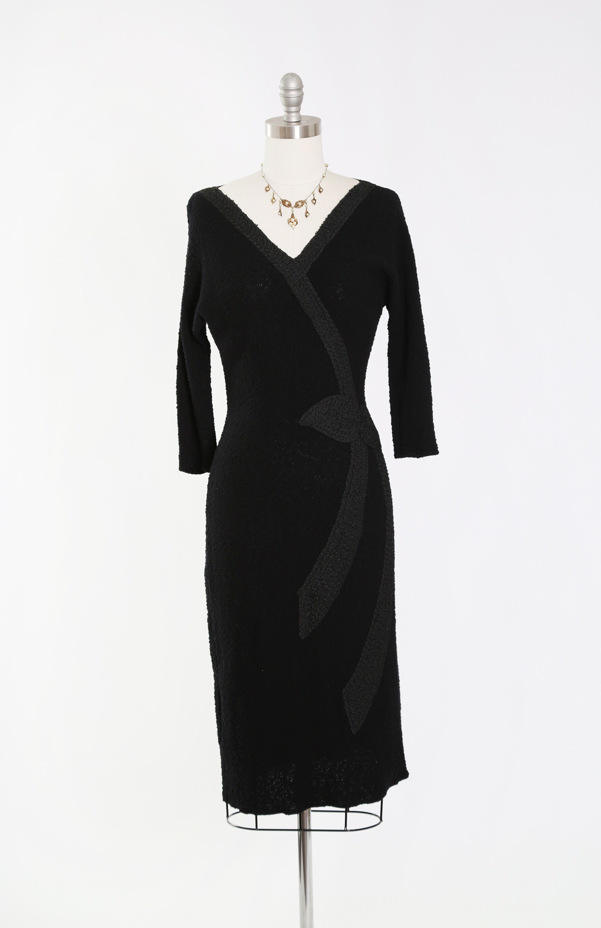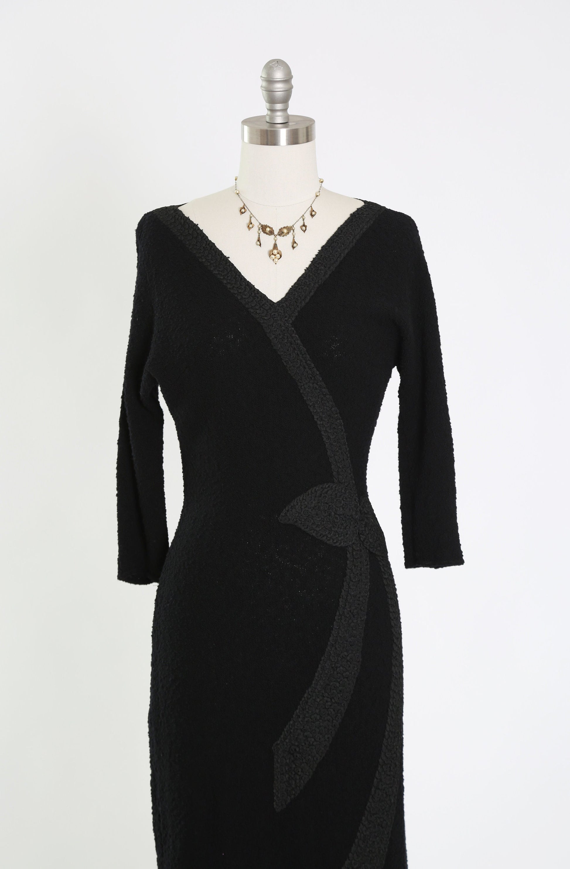 Vintage 40s black knit dress | 1940s crochet ribbon dress