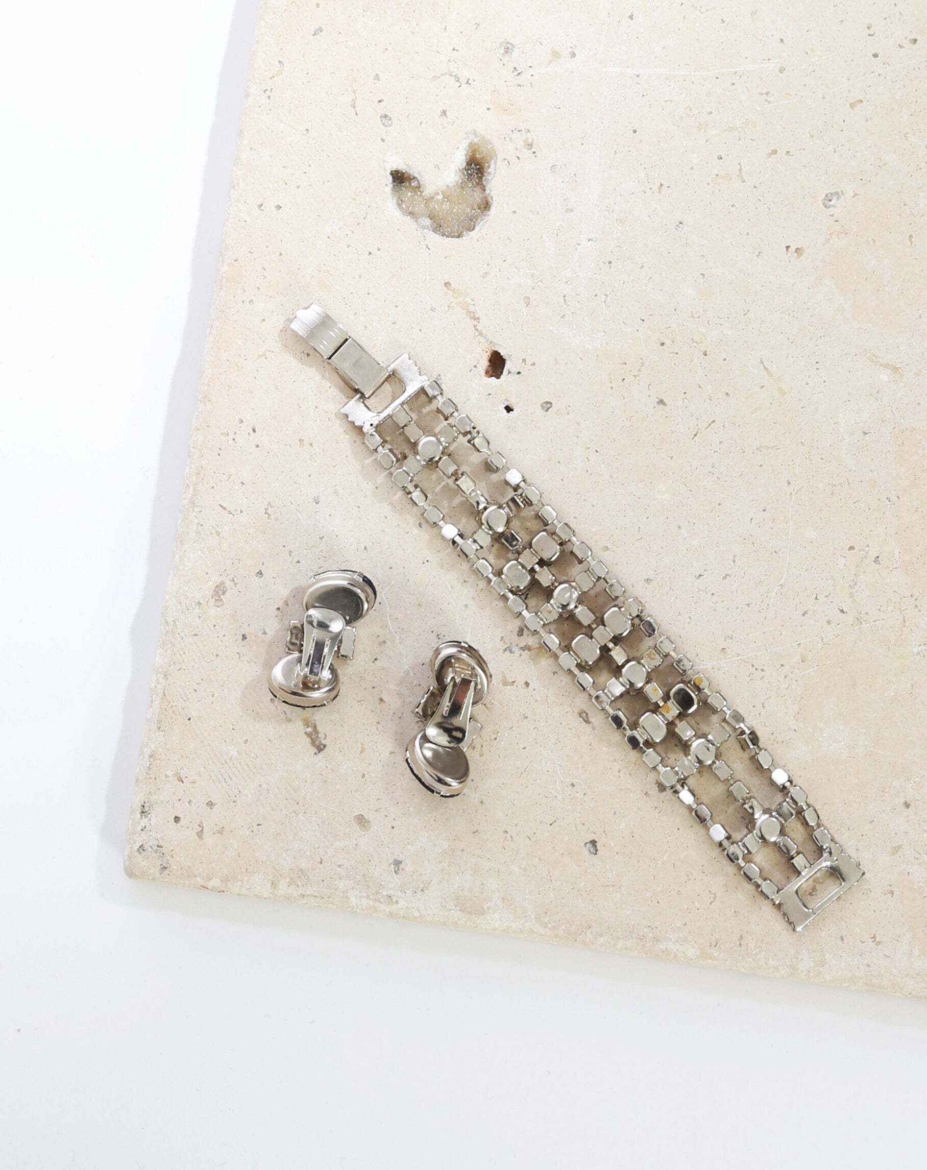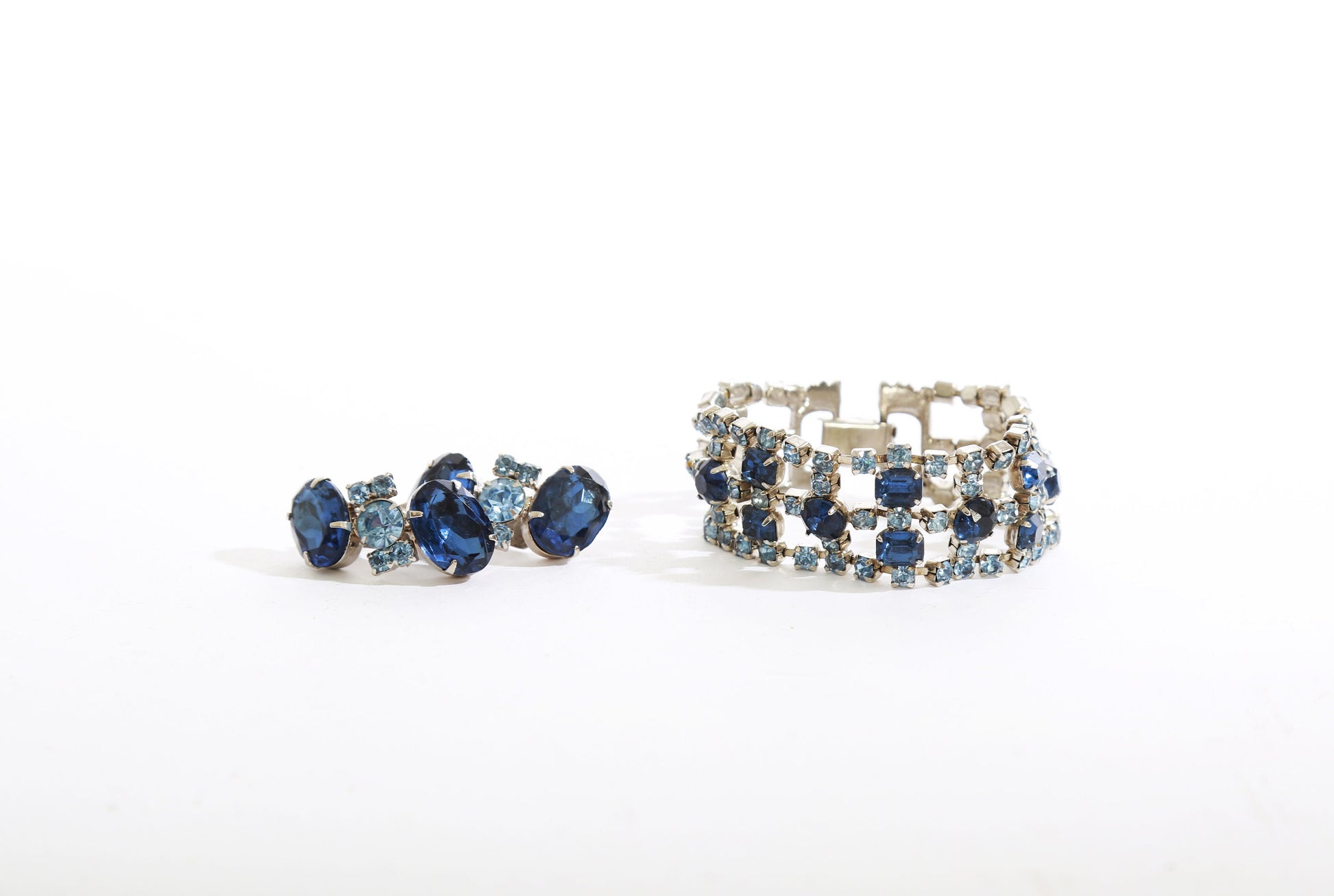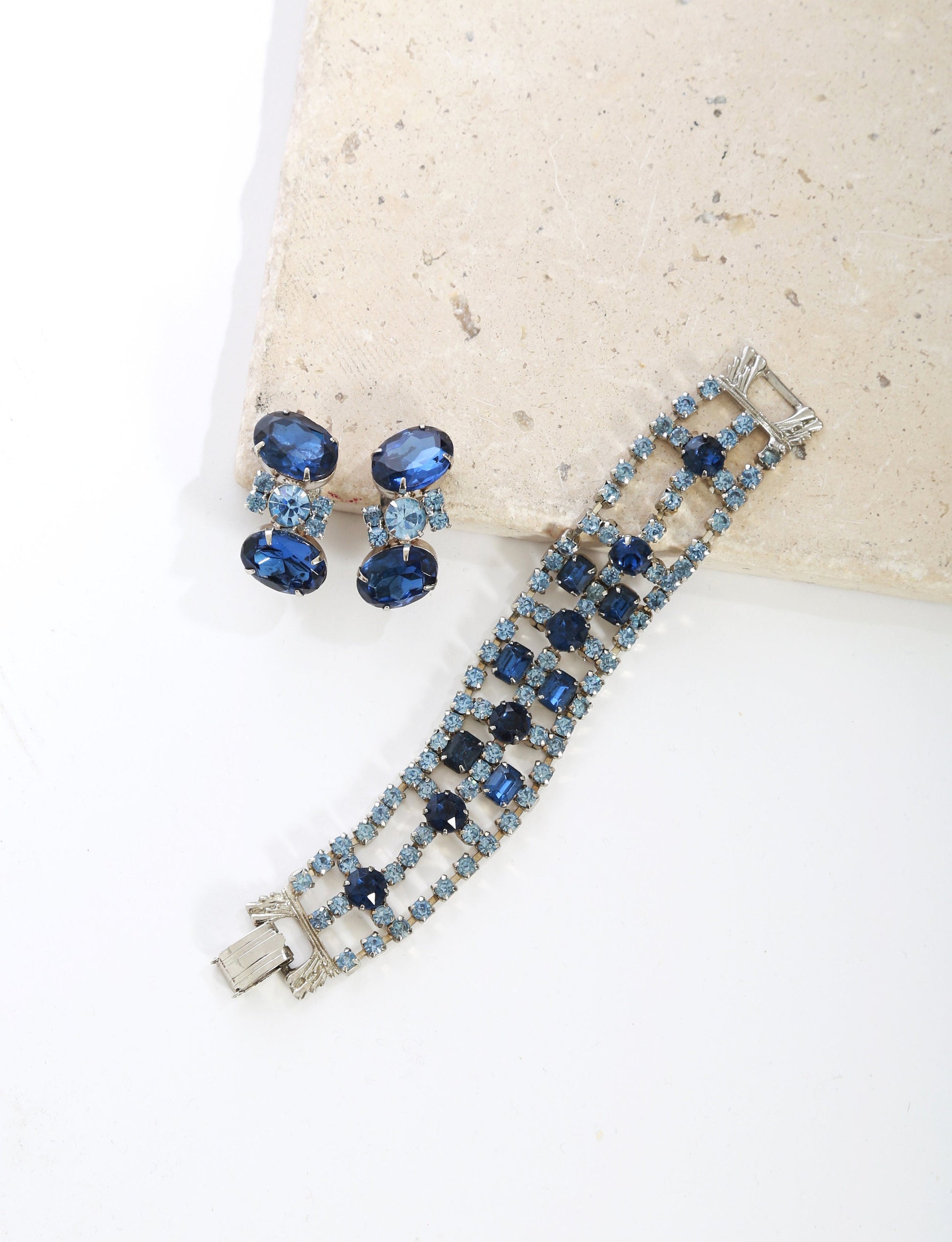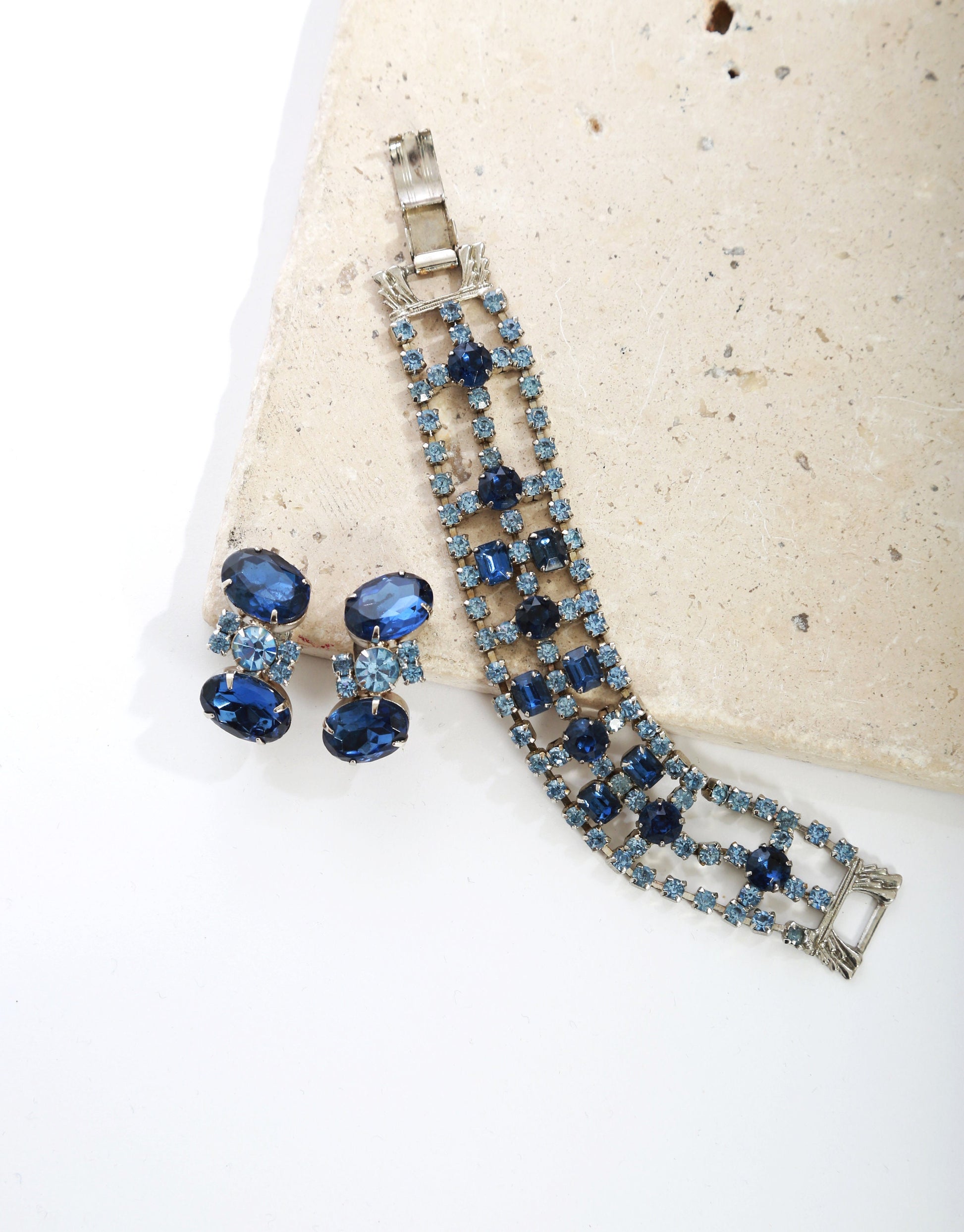 Vintage 50s blue glass rhinestone bracelet + earrings
