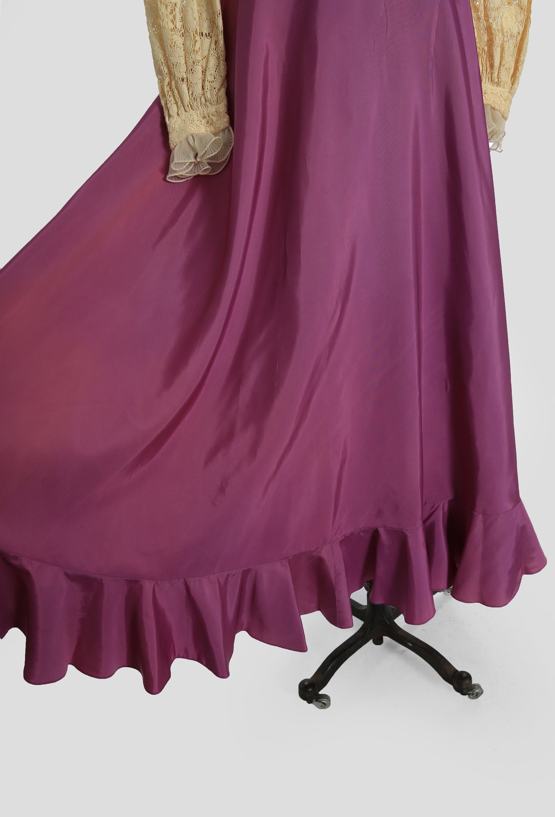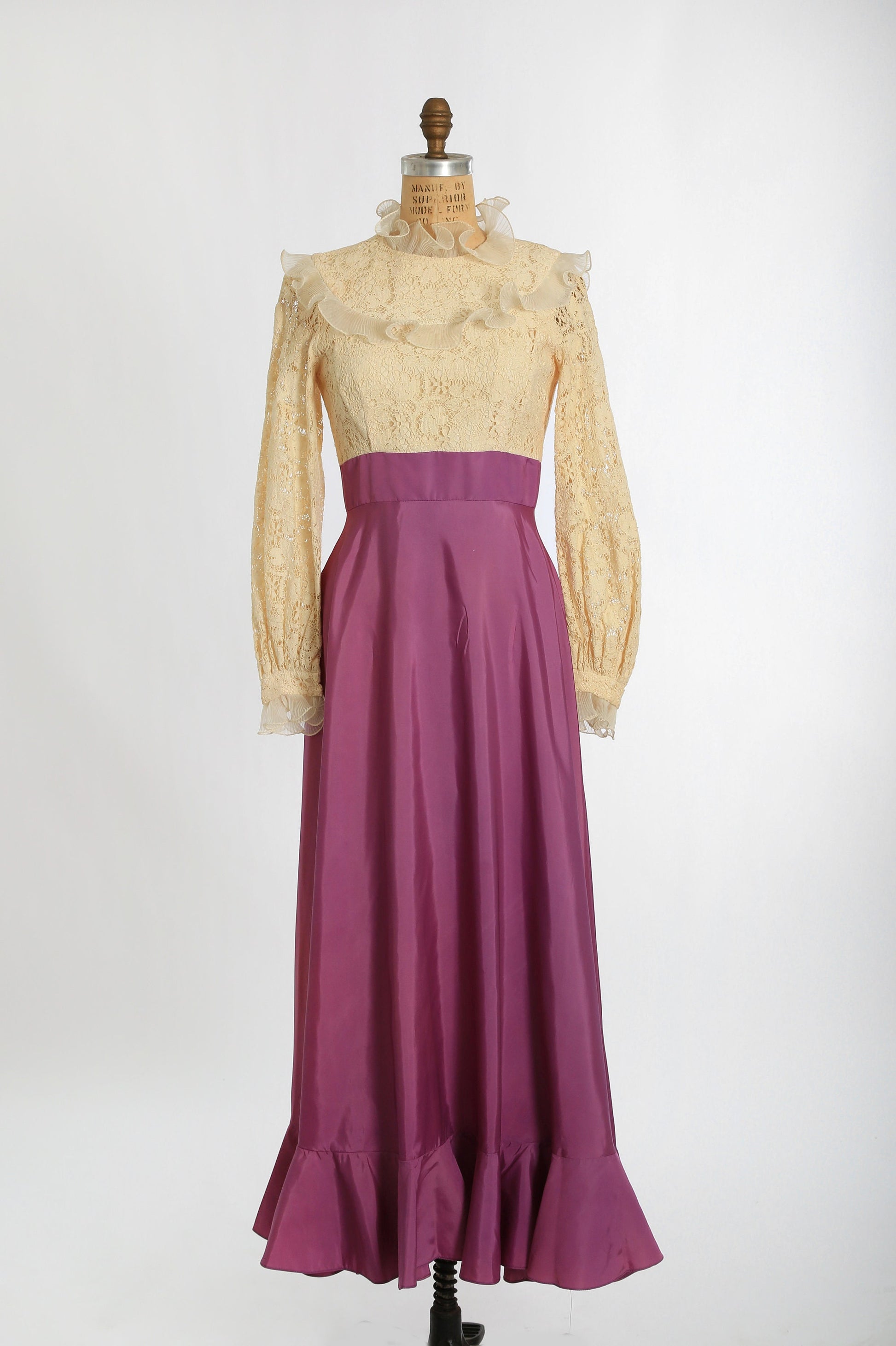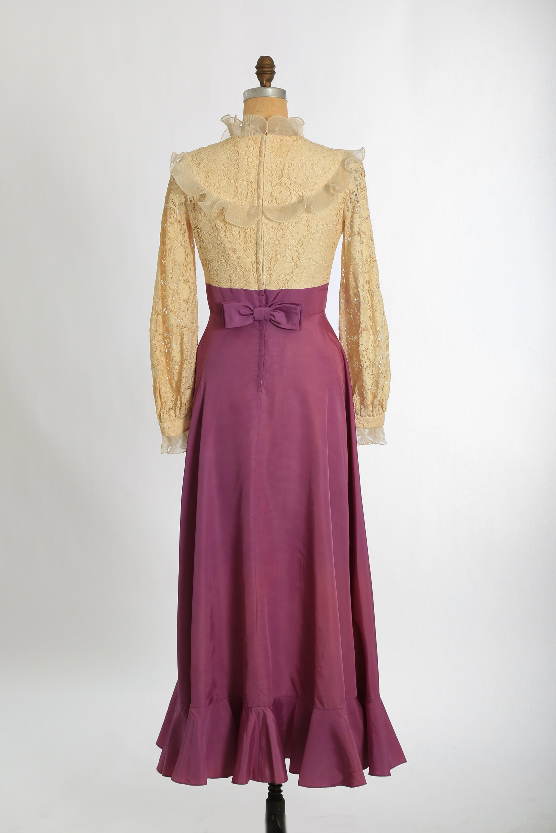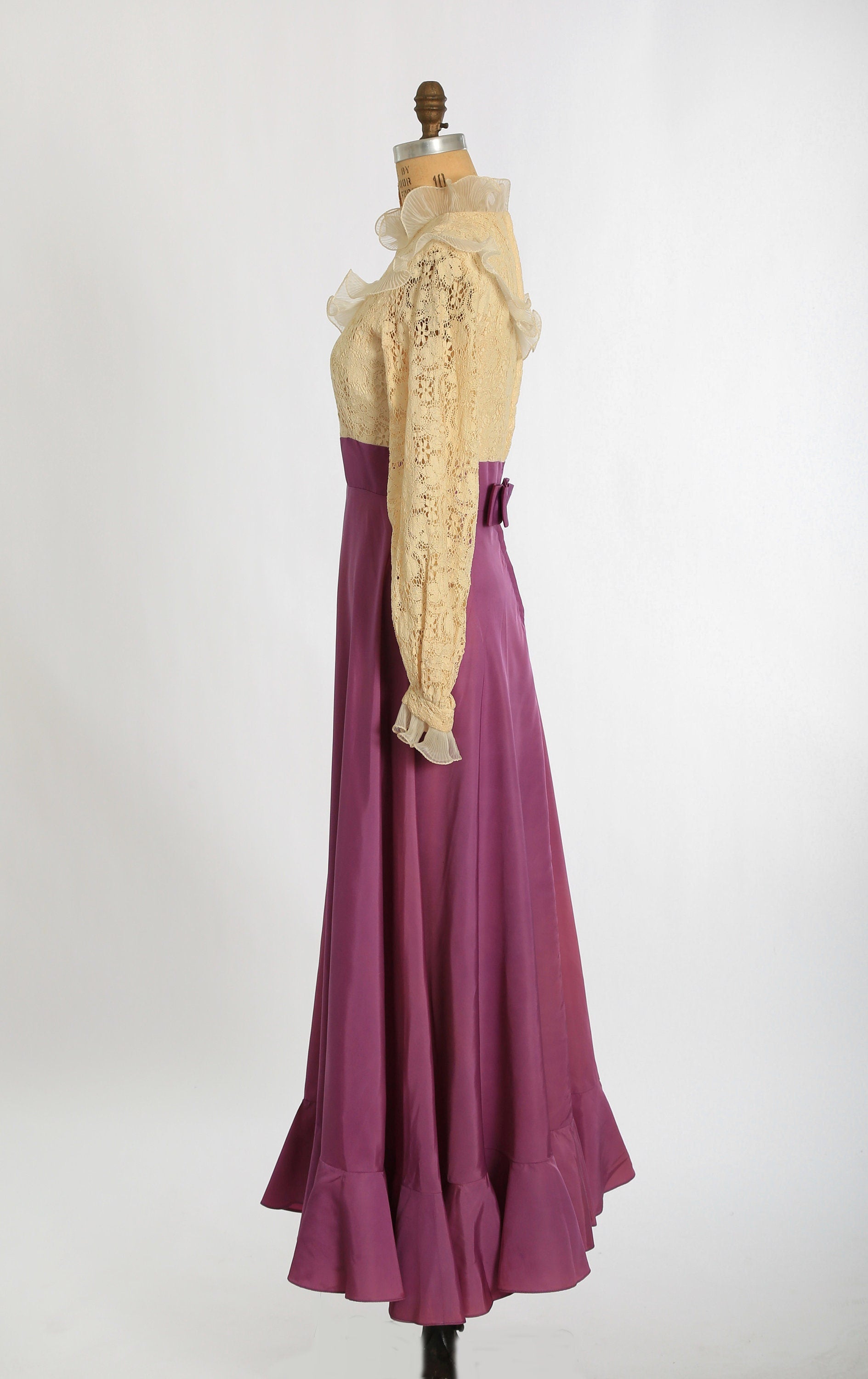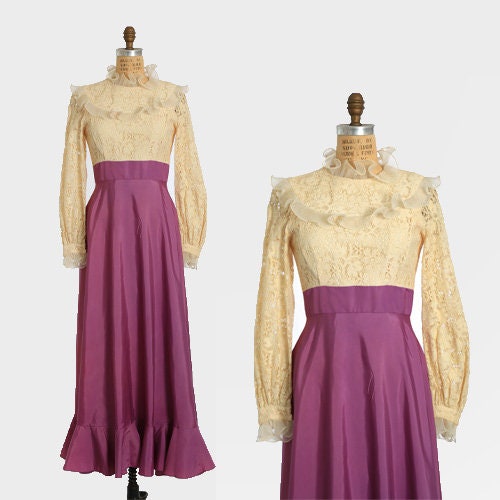 Vintage 70s ivory crochet lace purple ruffle Maxi dress