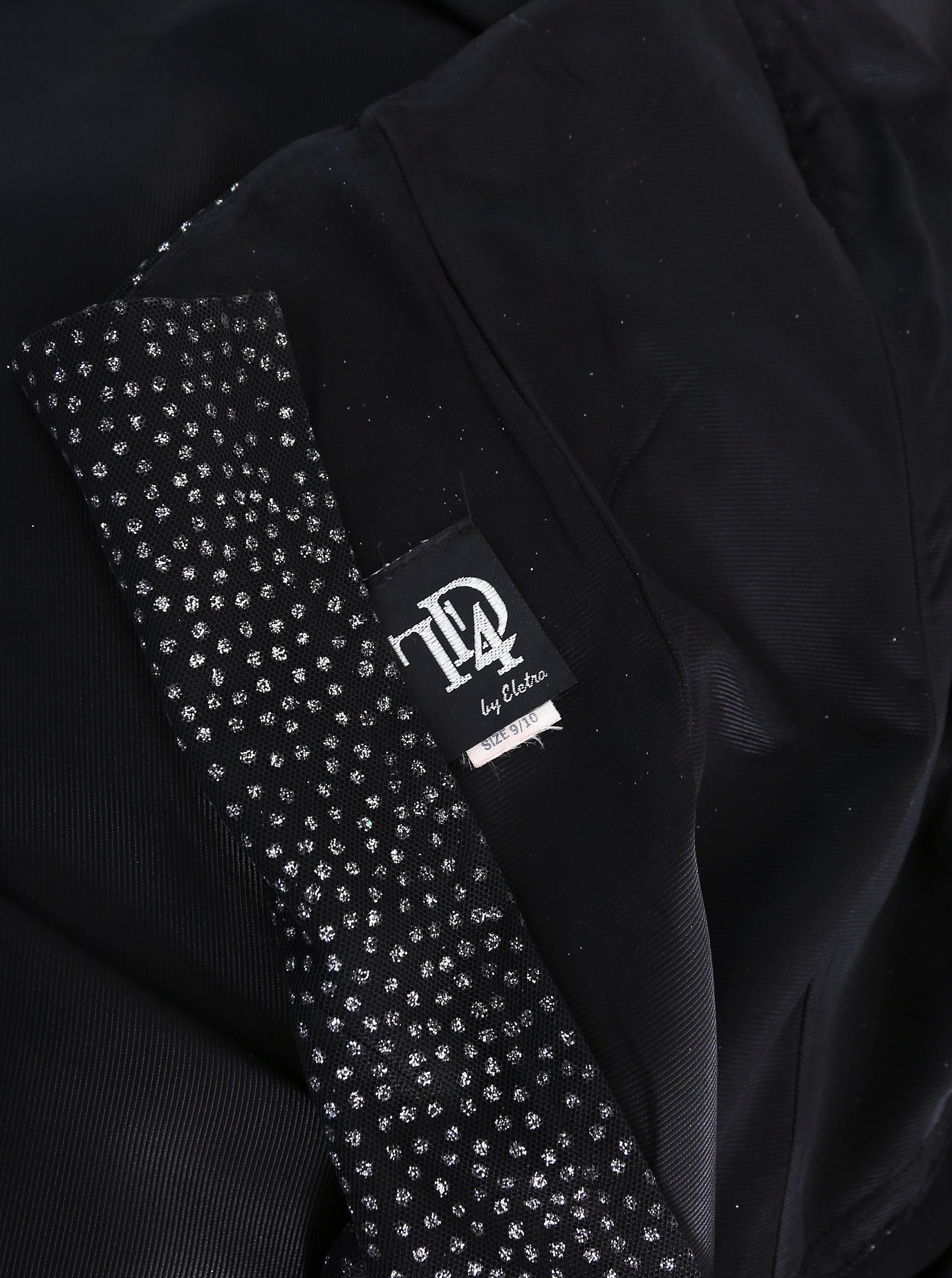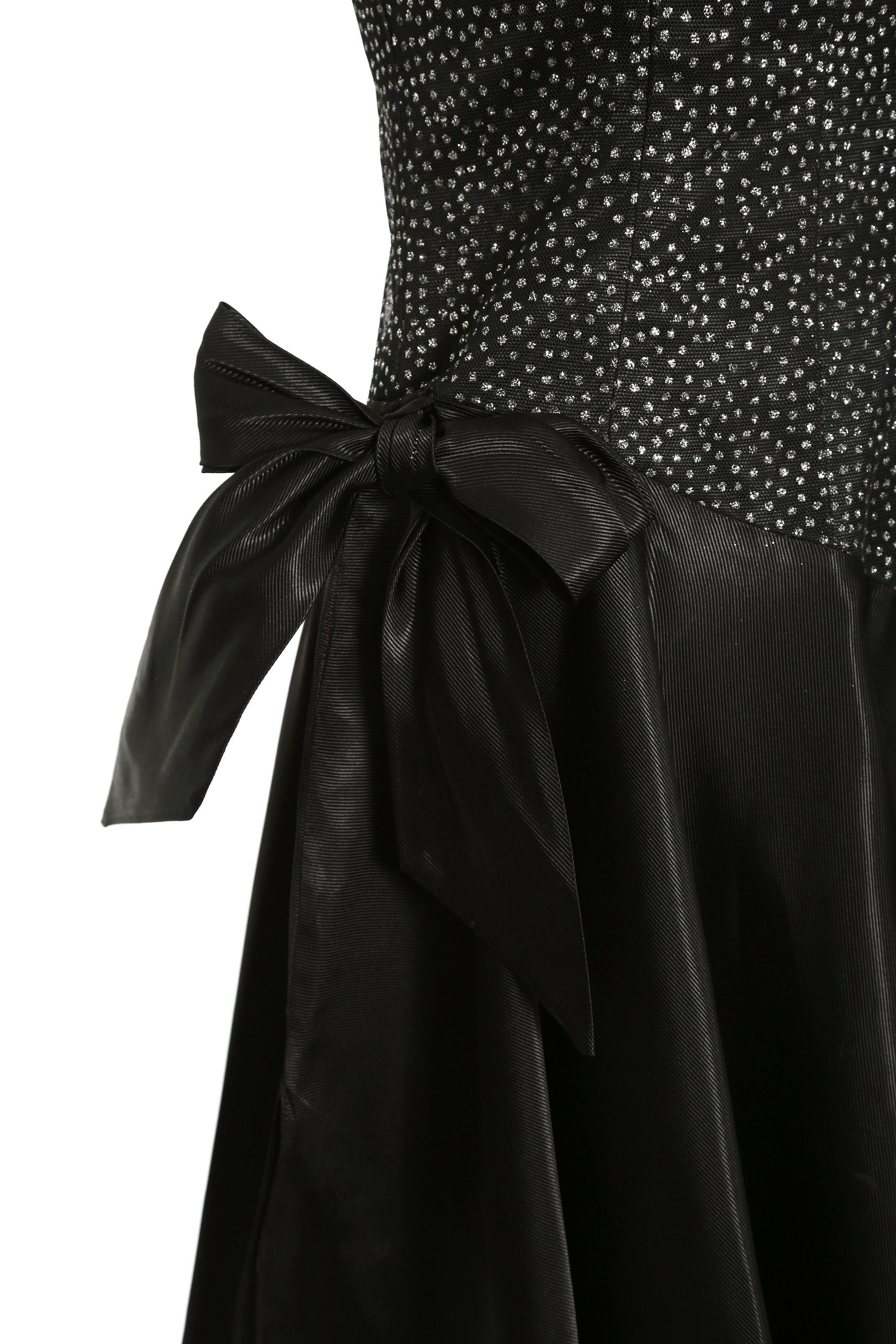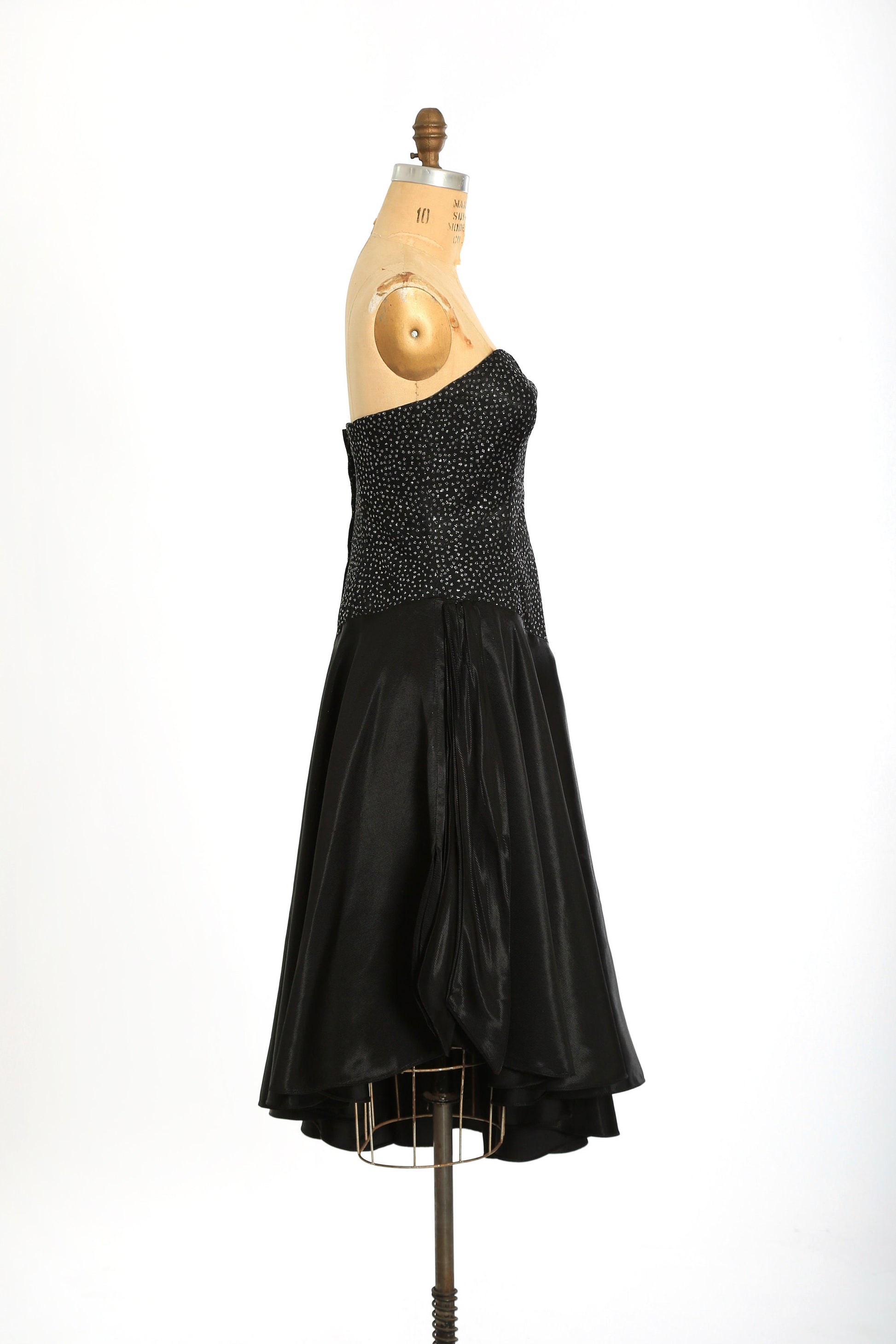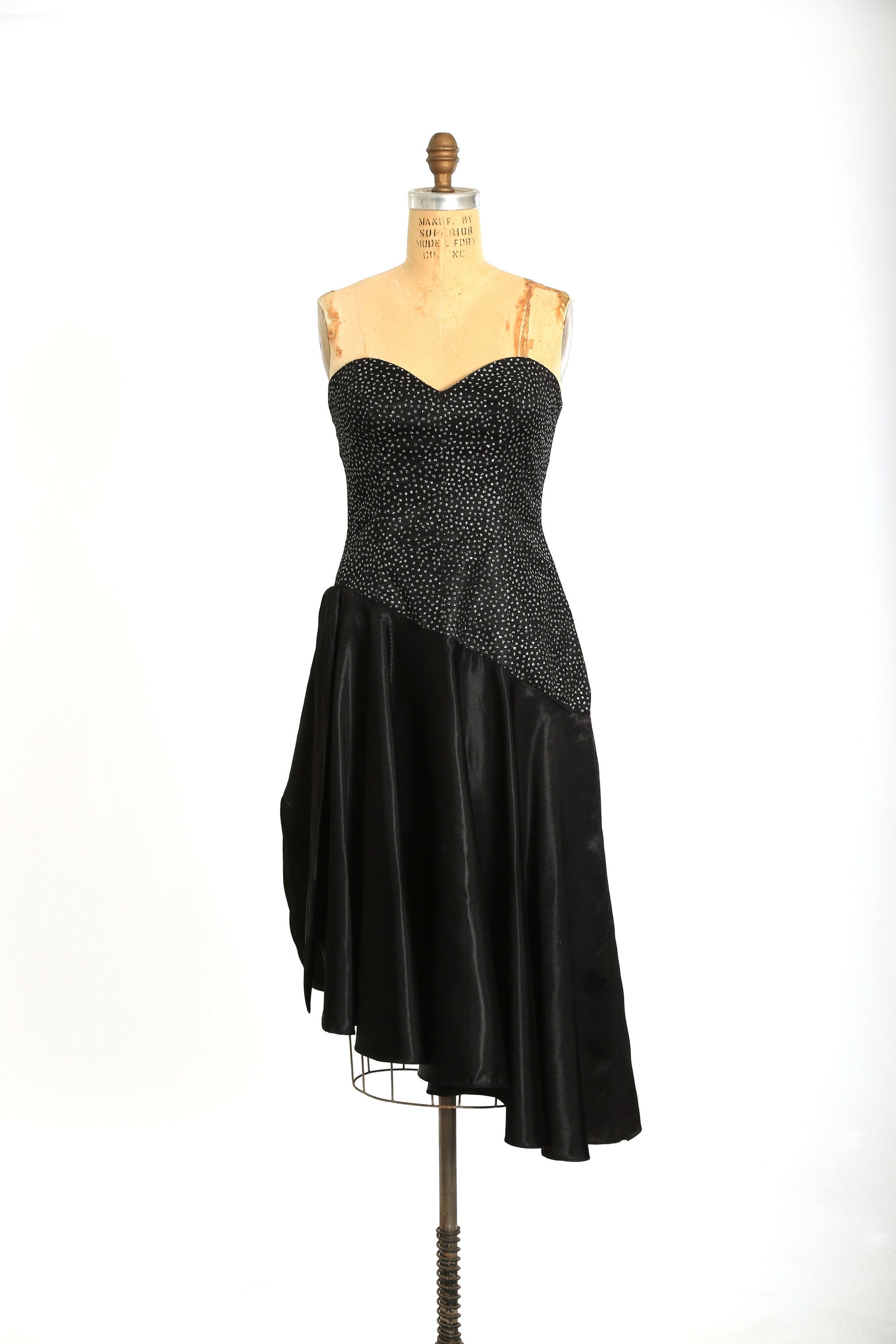 Vintage 90s does 50s black glitter asymmetrical satin cocktail dress
