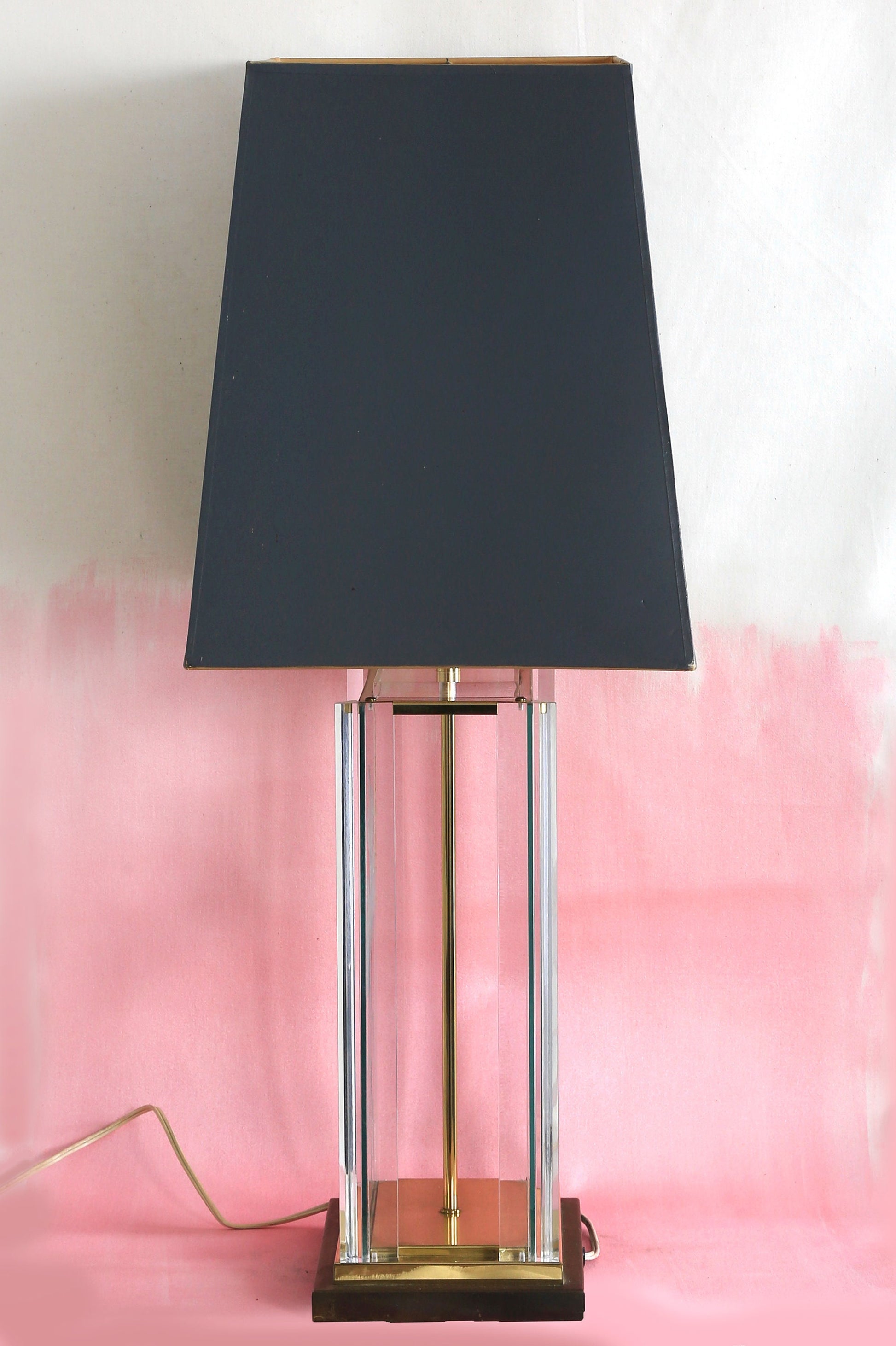 Acrylic prisms on sides with clear glass etched floral motif with oversized gray shade