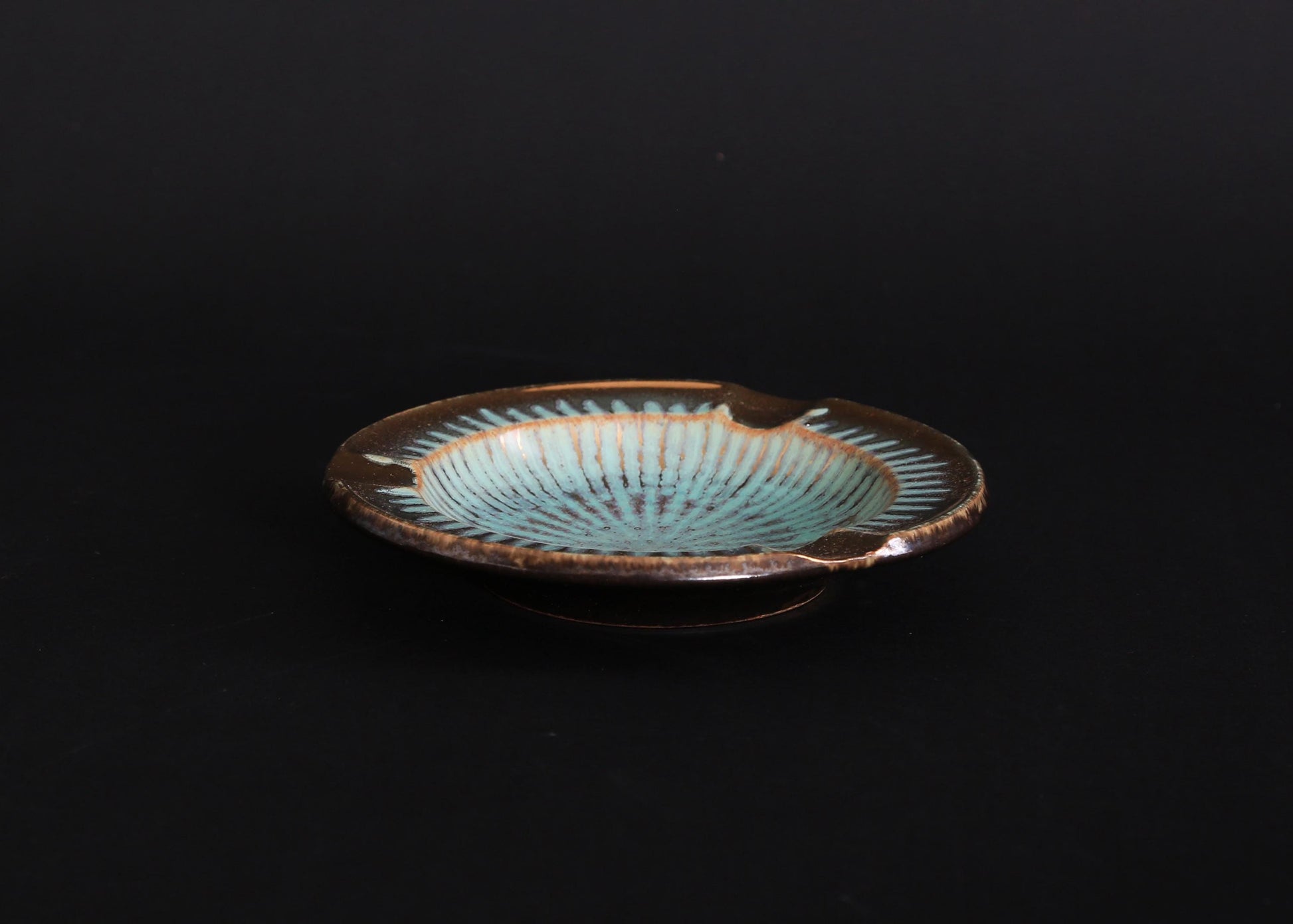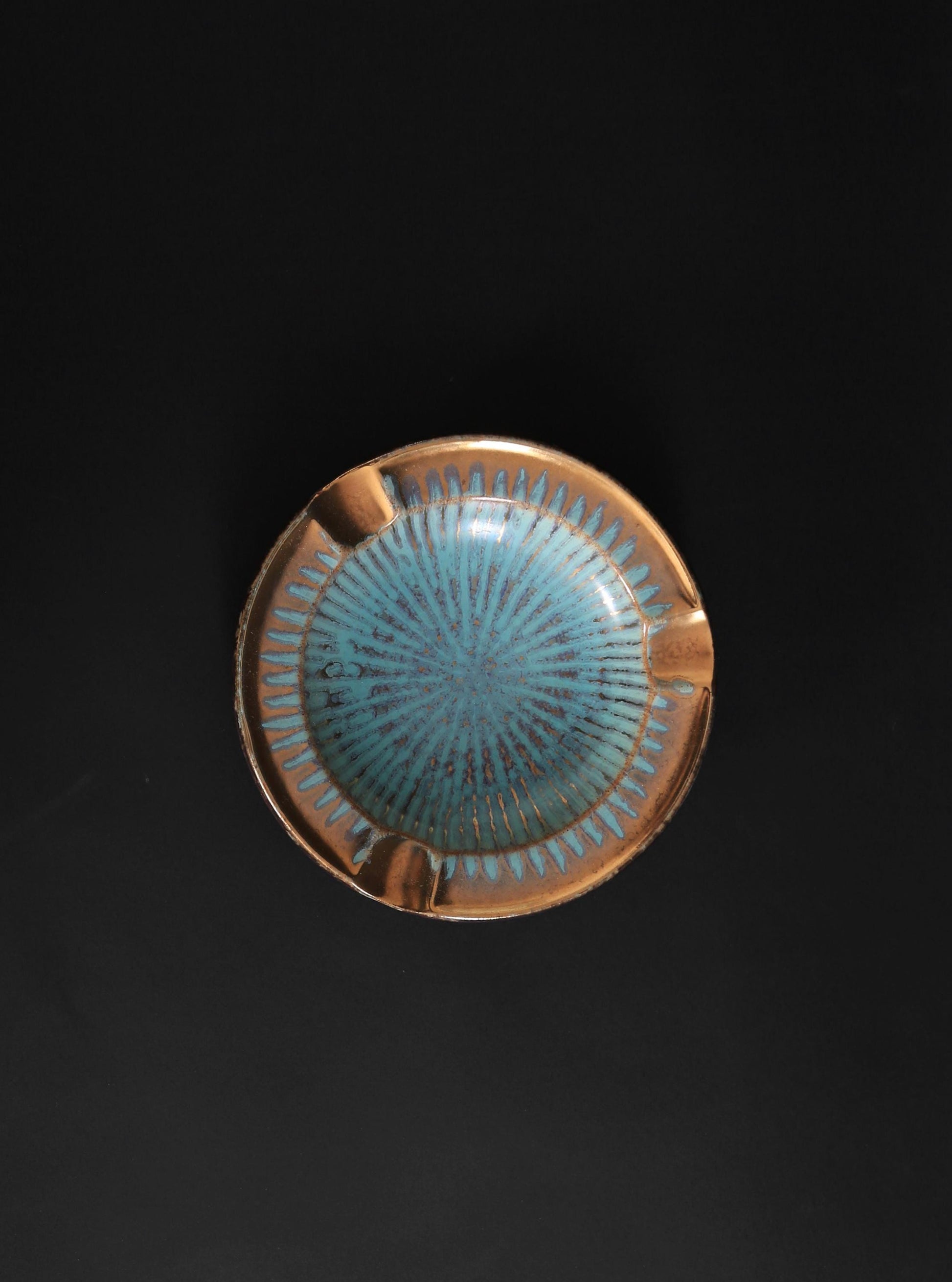Vintage 1950s Metallic gold + turquoise blue starburst stoneware ashtray